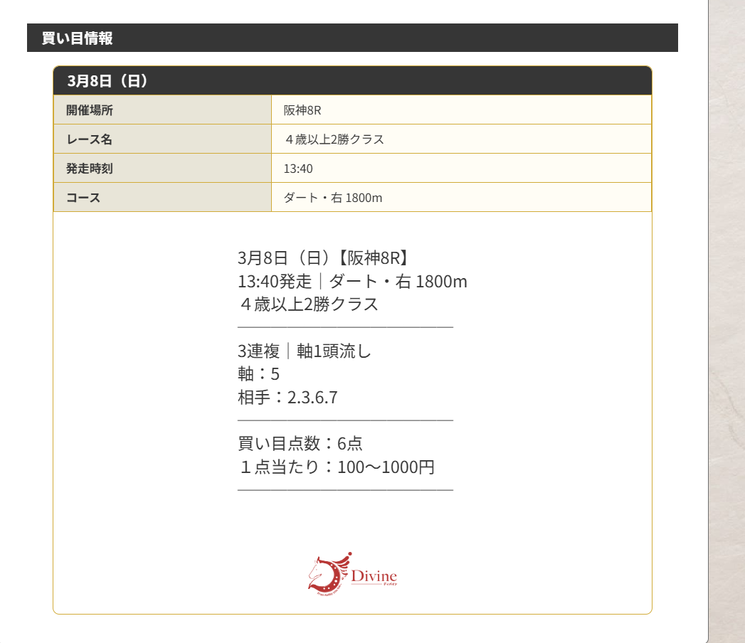 唯一の的中はディバインさんを使った予想に乗ったレースで万馬券