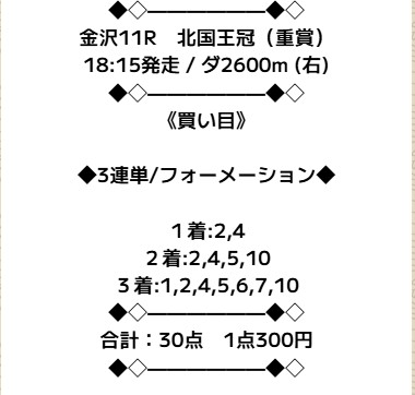 つい先日も金沢の重賞、北国王冠で最下位人気を的中させて1690.4倍の特大10万馬券的中しました。